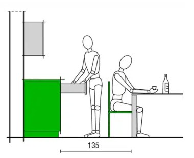 Όπου πρέπει να έχετε πρόσβαση σε πόρτες ή συρτάρια των ντουλαπιών πίσω από ένα άτομο που κάθεται, απαιτείται τουλάχιστον 135 cm από την άκρη του τραπεζιού μέχρι το μπροστινό μέρος του ντουλαπιού.