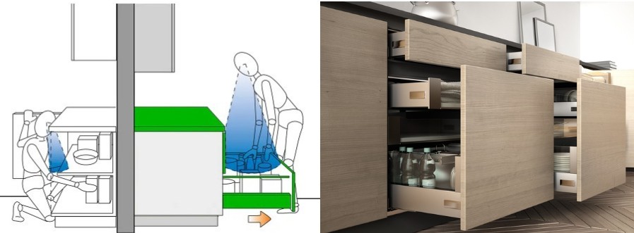 Παραδοσιακά, τα ντουλάπια βάσεως σε μια κουζίνα απαιτούν από τον χρήστη να γονατίσει για να επιθεωρήσει το περιεχόμενό τους.