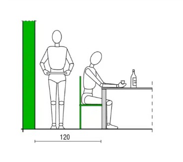 Για να υπάρχει άνετος χώρος καθισμάτων καθώς και επαρκής χώρος κίνησης γύρω από ένα τραπέζι, απαιτείται τουλάχιστον 120 cm από την άκρη του τραπεζιού μέχρι τον πλησιέστερο τοίχο ή εμπόδιο.